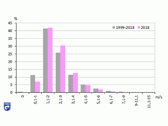 Megfigyeléseink szerint 2018-ban a talaj közelében az állomásokon mért szélsebesség évi átlaga 1,1-6,0 m/s között változott, országos átlagban 2,3 m/s adódott. Budapest Pestszentlőrinc állomáson a havi átlagos szélsebesség éves menetében (18. ábra) általában márciusban és áprilisban jelentkezik a maximum, míg a legalacsonyabb értékeit októberben veszi fel. 2018-ban a havi átlagos szélsebesség áprilisban volt a legnagyobb (2,7 m/s), melyet a decemberben (2,5 m/s) mért érték követ. A legalacsonyabb havi átlagos szélsebesség augusztusban adódott (2,0 m/s) a várt októberi szélminimum helyett.