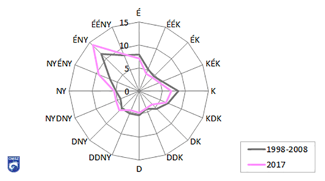 A 24. ábrán a szélirány gyakorisági eloszlását láthatjuk Budapest-Pestszentlőrincen az 1998-2008 közötti időszak átlaga és a 2017. év adatai alapján. A sokévi átlag jól mutatja, hogy Budapest esetében az uralkodó szélirány az északnyugati. A keleti szélirány hangsúlyosabb megjelenésének oka a városi hősziget jelensége, valamint a Budai-hegység és a Pesti-síkság közötti helyi légkörzés egymást erősítő hatásában keresendő. Jelentősebb légmozgással járó időjárási frontok 2017-ben északnyugati irányból érkeztek a megfigyelő helyre. A leggyakoribb szélirány mellett ehhez az irányszektorhoz tartozott a legnagyobb átlagsebesség, és a legerősebb széllökések. Ezzel szemben a második leggyakoribb keleti szélirány esetén az átlagos szélsebesség kisebb. A 1998-2008-as átlagnál valamivel nagyobb arányban jelentkezett az északnyugati szélirány, míg a vártnál kisebb relatív gyakoriság jellemezte a keleti szélirányt.