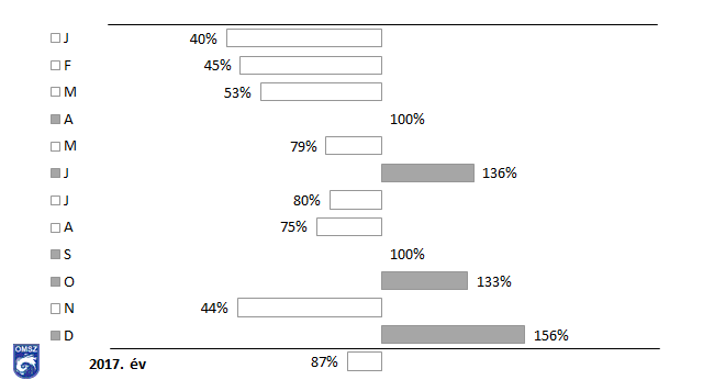 A 19. ábrán jól látható, hogy 2017 első felében májusig a szélsebesség havi átlagértékei jellemzően elmaradnak az 1981-2010-es sokévi átlagtól. A nyári hónapok július, augusztus és ősszel november volt átlagosan szeles. A legnagyobb pozitív eltérés októberben és decemberben mutatkozott meg: októberben 18 %-kal, decemberben 30 %-kal volt nagyobb a szélsebesség a szokásosnál. Összességében elmondható, hogy Budapest-Pestszentlőrinc állomáson az átlagos évi szélsebesség 2017. évben a sokévi átlagnak megfelelően alakult.