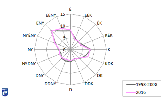 A 24. ábrán a szélirány gyakorisági eloszlását láthatjuk Budapest-Pestszentlőrincen az 1998-2008 közötti időszak átlaga és a 2016. év adatai alapján. Az átlag jól mutatja, hogy Budapest esetében az uralkodó szélirány az északnyugati. A keleti szélirány hangsúlyosabb megjelenésének oka a városi hősziget jelensége, valamint a Duna és a Pesti-síkság közötti helyi légkörzés egymást erősítő hatásában keresendő. Jelentősebb légmozgással járó időjárási frontok 2016-ban északnyugati irányból érkeztek a megfigyelő helyre. A leggyakoribb szélirány mellett ehhez az irányszektorhoz tartozott a legnagyobb átlagsebesség, az erőteljesebb széllökések. Ezzel szemben a második leggyakoribb keleties szélirányok esetén az alacsonyabb szélsebességértékek fordulnak elő gyakrabban. A 1998-2008-as átlagnál valamivel nagyobb arányban jelentkezett az észak-északnyugati szélirány, míg kisebb relatív gyakoriság jellemezte a dél-délnyugati szélirányt.