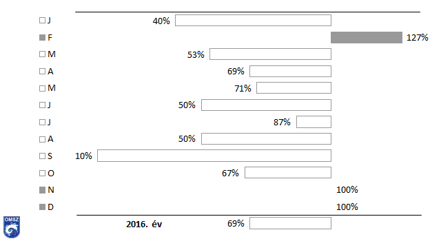 A 19. ábrán jól látható, hogy 2016-ban februárban és októberben a szélsebesség havi átlagértékei megegyeztek a sokévi átlaggal. A legnagyobb eltérés októberben mutatkozott meg, a szokásos szélsebesség 71%-át jegyeztük. Összességében elmondható, hogy a 2016. évre vonatkozóan egy kicsivel gyengébb légmozgás volt jellemző a sokéves átlaghoz képest.