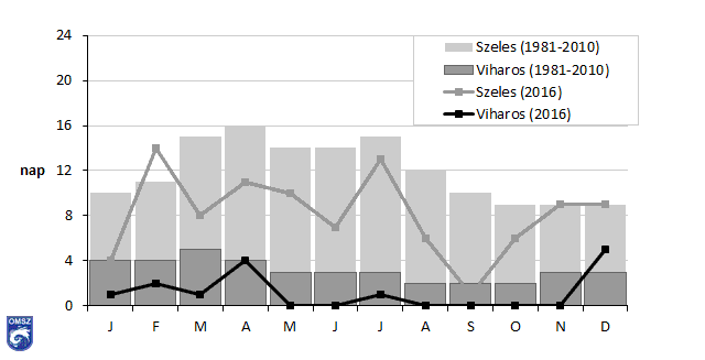 A szélviszonyokat jellemző küszöbnapok éves menetét a 21. ábrán mutatjuk be. A legtöbb szeles napot (napi maximális széllökés (fx) ≥ 10m/s) februárban (14 nap), második helyen júliusban (13 nap) jegyeztük, a legkevesebbet pedig szeptemberben (1 nap). Viharos napból (fx ≥ 15 m/s) decemberben fordult elő a legtöbb (5 nap). A sokévi átlagokkal összevetve Budapest-Pestszentlőrinc állomásunkon a legtöbb hónap elmaradt a normáltól mind a szeles, mind a viharos napok számában. Szeles napok közül egyedül február haladta meg a megszokott értékeket, míg a legnagyobb negatív anomália szeptemberben adódott (22. ábra). A novemberi és decemberi hónapok szeles napjainak száma a sokévi átlaggal megegyezett (9 nap). A viharos napok számában még nagyobb különbségeket láthatunk (23. ábra). Budapest-Pestszentlőrincen havonta 2-3 viharos napra számítunk a sokévi átlagok alapján, azonban 2016-ban hat hónapban (május, június, augusztus, szeptember október és november) egyáltalán nem jegyzetünk 15 m/s-nál nagyobb szélsebességet a talaj közelében országos átlagban. Összességében a sokévi átlag szerinti viharos napok mennyiségének mindössze 33%-át regisztráltuk 2016-ban.
