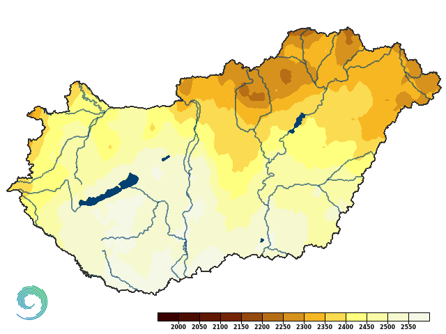 2024-ben a napsütéses órák éves összege hazánk területén 1950 és 2450 óra között változott. Az ország déli részén sütött a legtöbbet a Nap, általában 2300-2400 órát, míg a legkevesebb napsütéses óra az északkeleti (Borsod-Abaúj-Zemplén, Szabolcs-Szatmár-Bereg és Heves) vármegyékben volt, itt 2000-2200 óra volt a jellemző (21. ábra).