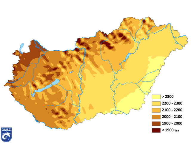 a legnagyobb területeken 2100-2300 óra közötti napsütés volt jellemző. ÉNy-DK irányú növekedés figyelhető meg: míg DNy-on és a magasabban fekvő