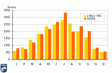 A napsütéses órák havi összegei 2006-ban és 1961-90 között
