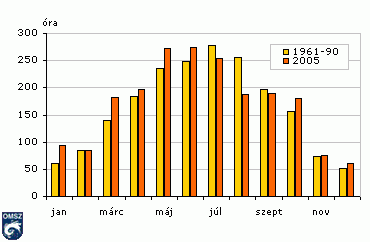 A napsütéses órák havi összegei 2005-ben és 1961-90 között