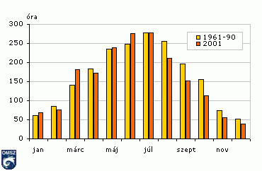 A napsütéses órák havi összegei 2001-ben és 1961-90 között