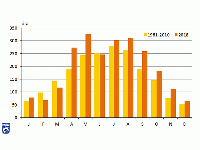 Országos átlagban 17 %-kal több napsütéses órát élvezhettünk 2018-ban, mint az 1981-2010-es sokévi átlag (normál: 2002 óra; 2018: 2340 óra). Ezúttal május bizonyult a leginkább napfényesnek a hónapok közül, de a vártnál legnagyobb eltérést novemberben és áprilisban tapasztaltuk (25. ábra), mivel a sokévi átlagnál 40%-nál többet összegeztük ekkor az országban. A normál időszakhoz képest szinte minden hónapban magasabb volt a napsütéses órák száma, csupán a februárra és márciusra vonatkozó érték maradt el jelentősebben az ilyenkor megszokott napfénytartam értékétől (26. ábra).