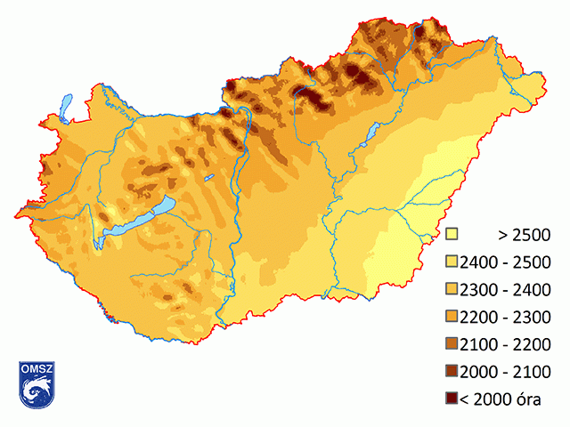 A napsütéses órák száma hazánk területén 2018-ban 2000 és 2500 óra között változott. A területi eloszlásában egy ÉNy-DK irányú növekedés volt megfigyelhető (27. ábra), az Alföld legnagyobb részén 2300 óra feletti értékek voltak jellemzőek, és csak az ország délkeleti részén a Békési-sík, a Nagy- és a Kis - Sárrét területén haladta meg a 2500 órát. A legalacsonyabb értékeket főként az észak-magyarországi hegyvidéki területeken figyeltük meg.