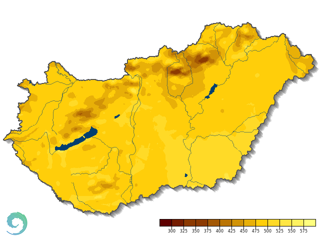 A 23. ábra a 2024. évi globálsugárzás összeg területi eloszlását mutatja be hazánkban. Az Alföldön sütött a legtöbbet a Nap (>500 kJ/cm2), a hegyvidéki területeken volt kevesebb napsütés, ezek közül is kiemelkedik a Bükk, a Mátra (2) és a Bakony (2).