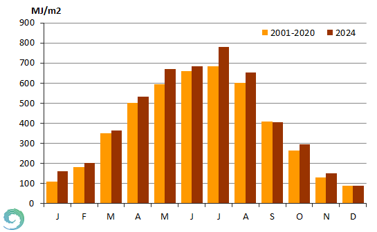 A Napból közvetlenül érkező (direkt) sugárzás és az égboltról érkező szórt (diffúz) sugárzás összegét globálsugárzásnak nevezzük. Területi eloszlása a domborzati adottságok mellett az átlagos felhőborítottsággal van kapcsolatban. A legmagasabb értékeket a derült nyári hónapokban, sokévi átlag szerint júliusban várjuk. A globálsugárzás évi összege Budapest Pestszentlőrinc állomáson 2024-ben meghaladta az 2001-2020-as sokéves átlagot. A legmagasabb havi összeget (781 MJ/m2) ebben az évben júliusban jegyeztük, ami jelentősen meghaladta az ilyenkor szokásos mennyiséget. Csupán szeptemberben volt az ilyenkor megszokottnál kissé kevesebb, decemberben pedig alig valamivel több a globálsugárzás összege (22. ábra). A normáltól vett legnagyobb százalékos eltérés januárban adódott (143%), amit a július (114%), majd a november (114%) követ. A legkisebb százalékos eltérést pedig decemberben figyeltük meg (100,6%).