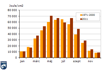 Globálsugárzásnak a Napból közvetlenül érkező (direkt) sugárzás és az égboltról érkező szórt (diffúz) sugárzás összegét nevezzük. Alakulása szoros összefüggést mutat a napfénytartammal, így nem csoda, hogy a 2011-es május, augusztus és szeptember a napsütéses órák számához hasonlóan itt is kimagasló értékkel jelenik meg (26. ábra). Különbség viszont a napfénytartamhoz képest, hogy a maximum nem augusztusban, hanem májusban volt jellemző. A globálsugárzás havi menete is eltért a szokásostól, a májusi és augusztusi kiemelkedő értékei között, a június-július hónapok szokatlan mélypontként jelentkeztek.