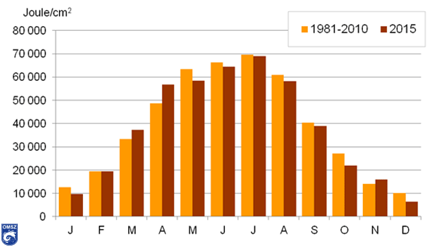Globálsugárzásnak a Napból közvetlenül érkező (direkt) sugárzás és az égboltról érkező szórt (diffúz) sugárzás összegét nevezzük. Alakulása szoros összefüggést mutat a napfénytartammal, ennek megfelelően 2015-ben a globálsugárzás