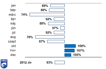 A relatív nedvesség havi átlaga Budapest-Pestszentlőrincen 2012-ben az 1971-2000-es normál százalékában