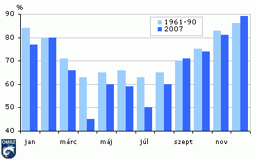 A relatív nedvesség 2007. éves értéke valamivel átlag alatt alakult. Mindössze 2 hónapban regisztráltak átlagot meghaladó nedvesség értékeket.