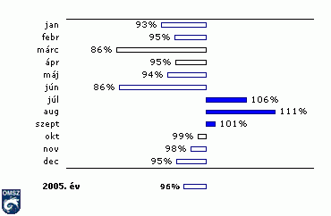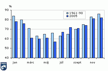 A relatív nedvesség 2005. éves értéke átlag körül alakult, annak ellenére, hogy mindössze 3 hónapban regisztráltak átlagot meghaladó nedvesség értékeket (28. ábra).