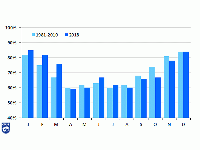 Pestszentlőrincen 2018-ban a legalacsonyabb havi átlagos relatív nedvességet a derült, csapadékmentes időjárású áprilisban (59%) mértük, míg a legmagasabb érték ezúttal januárban (85%) adódott. A tavaszi hónapokban (április, május) és augusztustól az év végéig a relatív nedvesség havi értékei a normálértékhez nagyon hasonlóan alakultak. A megszokotthoz képest (31. ábra) pozitív anomália adódott az év első három hónapjában, illetve június-júliusban. Márciusban 13%-kal magasabb volt a levegő relatív nedvességtartama, mint a harmincéves átlag. A legnagyobb negatív eltérést pedig októberben (91%) tapasztaltuk az 1981-2010-es normálhoz viszonyítva.