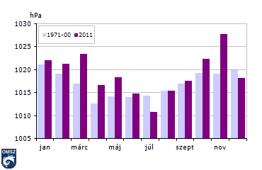 A havi átlagos légnyomás értékek alapján a nagytérségű nyomási képződmények gyakoriságára következtethetünk. A Pestszentlőrincen mért, novemberi magas nyomási érték (29. ábra) arra az anticiklonra utal, amelynek hatására megdőlt a novemberi szárazsági rekord, illetve amely több napon át tartó szmogriadós helyzetet eredményezett. A szokásoshoz képest szintén jóval nagyobb értékek jelentkeztek márciusban is. A július alacsony nyomási értéke ezzel szemben intenzív ciklontevékenységre utal, mely a számottevő havi csapadékösszegben is tetten érhető volt. A légnyomás általában április és július között a legalacsonyabb, és az év többi részében magasabb. A szokásos menetet 2011-ben elsősorban az említett, három kirívó hónap törte meg.