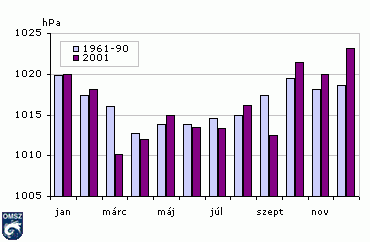 A légnyomás átlagos értéke a nagytérségû időjárási képzõdmények gyakoriságát jellemzi. A tengerszinti légnyomás átlagos- és 2001 évi menetét mutatja be a 27. ábra oszlopdiagramja.
