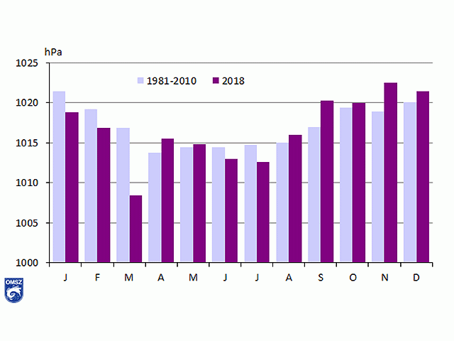 A havi átlagos légnyomás értékek alapján a nagytérségű nyomási képződmények gyakoriságára következtethetünk. Budapest Pestszentlőrincen a tengerszinti légnyomás havi átlaga 2018 első negyedévében a megszokott értékek alatt alakult, ami az alacsony nyomású légköri képződmények nagyobb gyakoriságára utal (32. ábra). Április és május hónapban az átlagnál magasabb értékek adódtak, hasonlóan augusztustól kezdve az őszi-téli hónapokban, amelyek jellemzően derült, csapadékmentes időjárásúak voltak (szeptember, november). A 2018. márciusi átlagérték messze alulmúlta az ilyenkor szokásos légnyomás értéket. Ekkor jelentős lehűlés történt, és a megélénkült ciklontevékenység miatt jelentős mennyiségű csapadék hullott nagyrészt hó formájában.