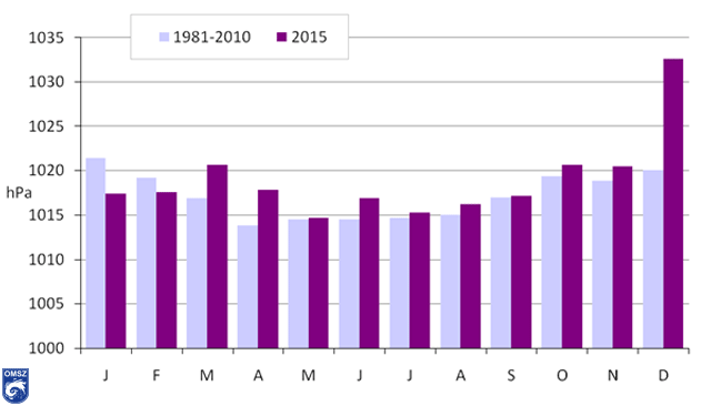 volt azoknál – csupán januárban és februárban látható negatív anomália. A 2015. decemberi érték messze felülmúlta az ilyenkor szokásos légnyomás értéket.