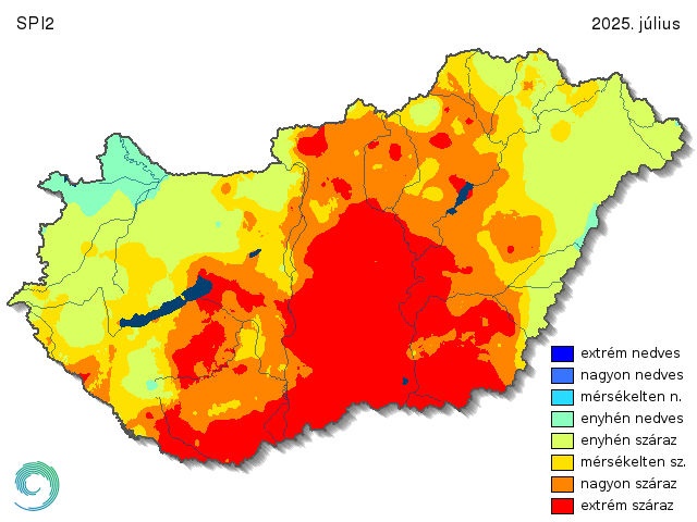 A júliusi SPI2 térkép (14. ábra) a nyár első kéthónapjának az aszály helyzetéről ad képet. A rendkívül száraz június után a júliusban érkezett csapadék némiképp javított a helyzeten. Bár az Alföldön többnyire a nagyon és az extrém száraz kategóriák jelzik, hogy sokat nem javult a helyzet. Északkeleten és északnyugaton már megjelennek enyhén száraz területek, a Kisalföld térségében pedig az enyhén nedves kategória is feltűnik.