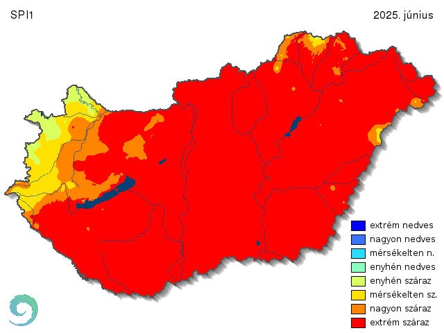 A standardizált csapadékindex (SPI) egyhavi értékeit 2025 júniusára mutatjuk be a 13. ábrán. A teljes ország valamely száraz kategóriába sorolható, túlnyomó része az extrém száraz kategóriába esik. Északnyugat-Magyarországon a határ felé haladva előbb a nagyon, majd a mérsékelten, végül az enyhén száraz kategória is feltűnik.
