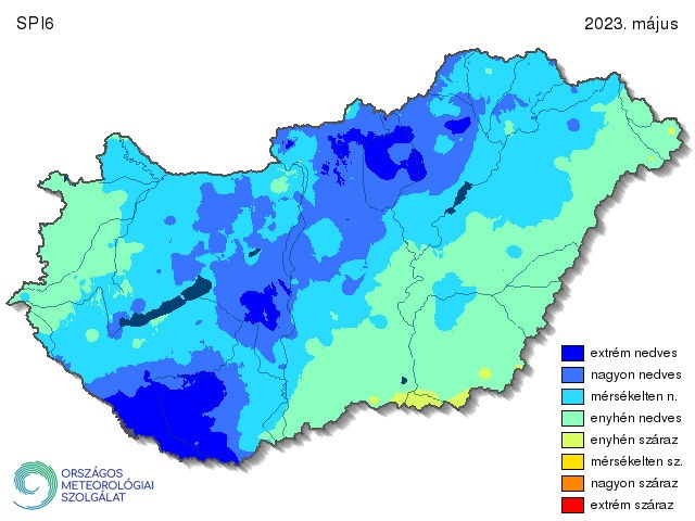 A májusi SPI6 a 2022 decembere óta lehullott félévnyi csapadékot veszi figyelembe. Ebben a hosszabb időszakban országos viszonylatban egyértelműen csapadéktöbblet volt jellemző. A nedves telet egy az átlagnál kissé csapadékosabb tavasz követte, így a két évszakot összegezve országszerte a nedves kategóriák kerültek túlsúlyba (15. ábra). Csak az Alföld déli részén és a Szatmári-síkságon jelentkeztek enyhén száraz kategóriájú területeket.