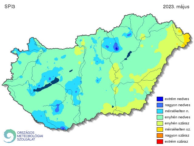 A standardizált csapadékindex (SPI) egyhavi értékei 2023 márciusában az ország nagyrészén az enyhén nedves kategóriába estek, a Kisalföldön és a déli határ mentén voltak csupán szárazabb területek. Áprilisban az ország déli és középső részein enyhén száraz vagy annál kedvezőtlenebb, míg másik részén enyhén nedves vagy annál csapadékosabb körülmények uralkodtak. Májusban döntő többségben az enyhén nedves kategória volt jellemző. Egy északkeleti-délnyugati tengely mentén előfordultak mérsékelten és nagyon nedves területek, míg Szabolcs-Szatmár-Bereg vármegyében mérsékelten és nagyon száraz területek jelentkeztek (13. ábra).