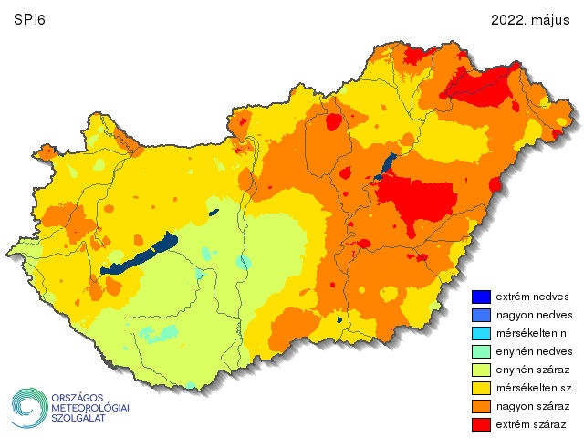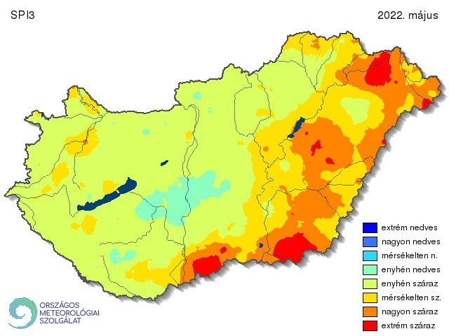 Aszály szempontjából a tavaszi időszakot összességében legjobban az SPI3 májusi eloszlása jellemzi (12. ábra). A 2022-es tavaszi csapadékösszeg jelentősen elmaradt a szokásostól, főként a Tiszántúlon és Bács-Kiskun megye déli részén jelentkezett nagyobb csapadékhiány, ezeken a területeken nagyon száraz, valamint extrém száraz feltételek is kialakultak a tavasz folyamán, de Szabolcs-Szatmár-Bereg megye, Hajdú-Bihar megye bizonyos régiói, Jász-Nagykun-Szolnok és Csongrád-Csanád megyék területén is nagyon, vagy extrém száraz állapotok domináltak. Az ország többi részén az enyhén száraz kategória volt a meghatározó. Csupán a Mezőföldön és a Duna-menti síkságon alakult ki nagyobb, összefüggő terület, amely az enyhén nedves kategóriába sorolható.