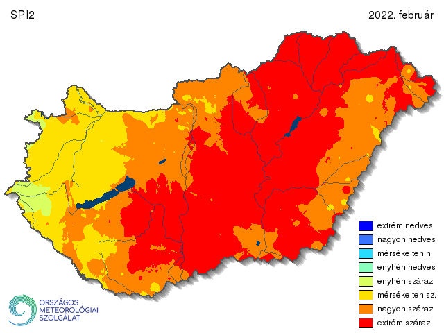A 461 állomásra számított SPI1 értékek alapján a 2021/2022-es tél hónapjai közül 2022 januárja lett a legszárazabb, bár mutat területi változékonyságot is. A Balaton és a Tisza-tó közé eső országrészek a nagyon száraz kategóriába tartoznak (sőt ezeken belül van több extrém száraz is), míg Vas, Zala és Veszprém megyék legnagyobb részén az enyhén száraz kategória a jellemző. Az SPI egyhavi értékei így mindenhol elérték a meteorológiai aszály kategóriáját. A januári egyhavi SPI-nél viszont érdekesebb a februári kéthavi SPI, mely az év kezdetének aszályosságát mutatja be jól (12. ábra). Itt már csak egy nagyon kis terület tartozik az enyhén száraz kategóriába, az ország nagyjából háromnegyede már nagyon száraznak számít. Az extrém száraz területek is már összefüggőek, az Alföld és az Északi-középhegység jelentős részére, valamint a Dunántúli-dombságra is ez a jellemző.