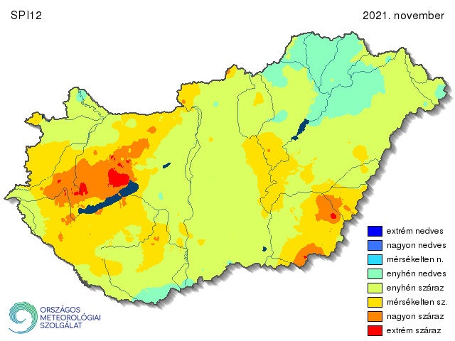 Az 1 éves időtávlatban érkező csapadékmennyiség ellenére is (SPI12) maradtak még extrém száraz területek a Bakonyban (15. ábra). Az SPI12 alapján ugyanakkor a Dunántúli jelentős része is még mérsékelten száraznak számít, akárcsak a Jászság, a Berettyó-Körös-vidék és a Körös-Maros-köze. Enyhén száraz területek találhatóak az ország legnagyobb részén. Minimális lokális csapadéktöbblettel jellemezhető térségek alig fordultak elő (enyhén nedves), csak a Dunántúl legdélebbi része: a Dráva-menti-síkság és a Tisza-tótól északkeletre fekvő területek ilyenek.