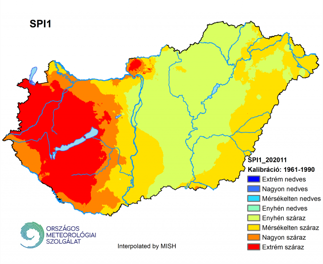 A 2020-as ősz összességében átlagos csapadékú volt, viszont novemberben, különösen a Dunántúlon, extrém meteorológiai aszály alakult ki (12. ábra). Országos átlagban az SPI1 értéke -1,49 volt, ami a mérsékelten és a nagyon száraz kategóriának a határát jelenti. Az elmúlt öt évben a november soha nem volt ilyen száraz, és az 1952-től kezdődő idősorban is csak alig tíz alkalommal érte el a novemberi országos csapadékösszeg a meteorológiai aszály kritériumát (SPI≤-1). Az eddigi legalacsonyabb SPI1 érték novemberben 2011-ben fordult elő, amikor az SPI1 értéke -4,17-nek adódott az 1961-1990 időszakhoz kalibrálva. 2020 novemberében a Dunától nyugatra eső tájak és a Börzsöny extrémen száraz kategóriába tartozott, míg a keleti országrész inkább az enyhén vagy mérsékelten száraz kategóriába került (12. ábra).