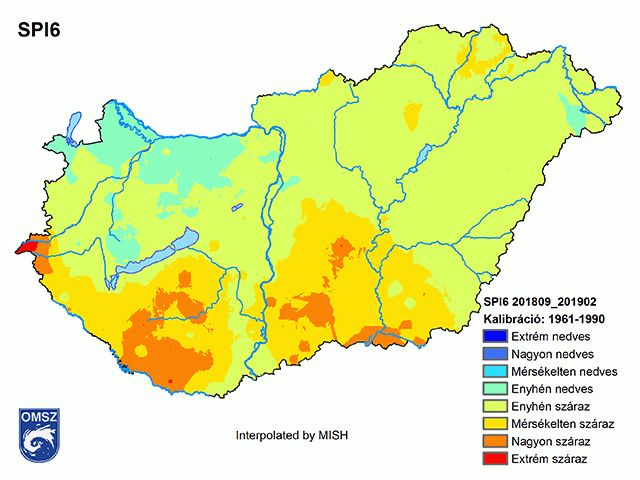 2018-ban az őszi hónapok is csapadékszegények voltak, mely hatással van az SPI6 értékére. 2018. szeptember és 2019. február között Vas megyében, illetve az ország déli részén találunk nagyobb térségeket, ahol jelentősen elmarad a lehulló csapadékmennyiség a sokévi átlagtól (13. ábra).