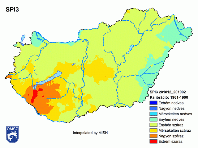 A téli 3 hónap SPI értékeinek területi eloszlása szerint (12. ábra) az ország délnyugati részén találunk nagyon száraz, míg Belső-Somogyban extrémen száraz kategóriába tartozó területeket. Máshol, főkét az északi és keleti határaink mentén, az enyhén nedves kategória is előfordult. 2019. februárban az SPI3 országos átlaga -0,7, mely ugyan száraz telet jelez, de országos átlagban nem lépte át az aszályhoz szükséges küszöbértéket (-1).