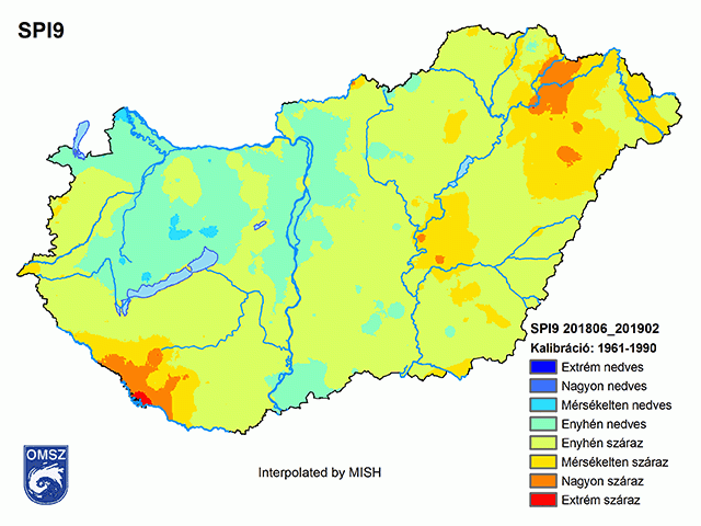 A 2018. évi nyári (SPI9) és a tavaszi időszakot (SPI12) is figyelembe véve a Dunántúl északi részét kivéve még az egész országban érzékelhetőek a tavalyi aszály nyomai. Az időtáv növekedésével az SPI9 térképén a Dráva mente, a Közép-Tisza vidéke és a Bodrogköz rajzolódik ki nagyon száraz területként (14. ábra). Ugyanezek a területek még 1 éves időtávlatban érkező csapadékmennyiség ellenére is (SPI12) aszályosak maradtak (15. ábra), azaz 2018. március és 2019. február között láthatóan kevesebb csapadék érkezett, mint az 1961-1990-es időszakban. Az SPI12 alapján ugyanakkor a Dunántúli-középhegységben lokálisan csapadéktöbblettel jellemezhető térségek is előfordultak (15. ábra).