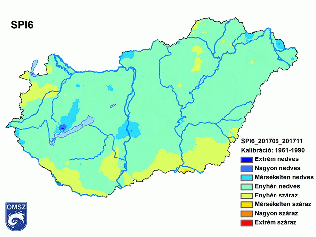 A novemberi SPI6 a június és november között lehullott csapadékmennyiséget viszonyítja az 1961-1990-es átlagokhoz (13. ábra). Ebben a féléves időszakban leginkább átlag körüli csapadékmennyiség hullott. Mérsékelten száraz kategória csak szűk területen jelentkezett, a déli országrészben, Szeged környékén. Foltokban azonban megjelentek az átlagosnál csapadékosabb régiók is.