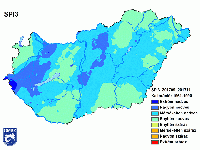 Az őszi időszakot az SPI3 novemberi eloszlása jellemzi (12. ábra). Látható, hogy a sokévi átlagot meghaladó csapadékmennyiség jellemezte az őszt. Az ország nagy része a mérsékelten nedves kategóriába tartozik. Ennél csapadékosabb területek az ország középső és a Dunántúl északi részein jelentkeztek. Extrém nedves terület is előfordult, leginkább az Őrség területén.