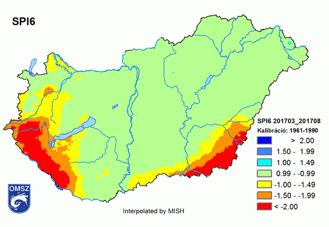 Az augusztusi SPI6 a március és augusztus között, tehát közel a teljes vegetációs periódusban lehullott csapadékmennyiséget viszonyítja az 1961-1990-es átlagokhoz. A 14. ábrán látható, hogy a Dunántúl délnyugati és az Alföld délkeleti területein már hosszabb ideje a sokévi átlag alatt maradt a lehulló csapadék mennyisége, mely valószínűleg negatív következményekkel jár az idei mezőgazdasági termelésre és az érintett régiók hidrológiai viszonyaira.