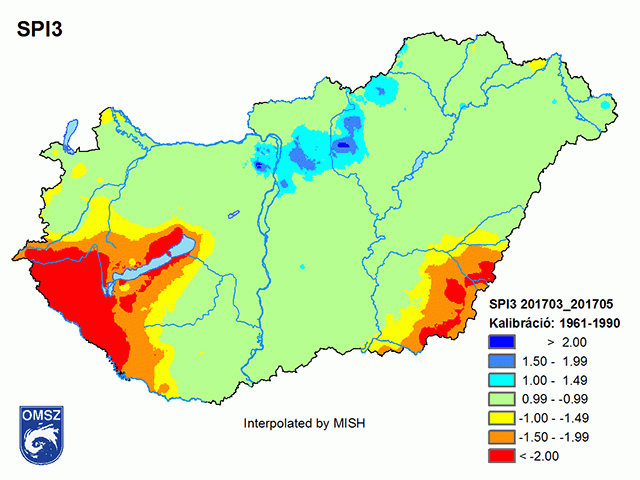 2017 eddig az aszályos évek sorába illeszkedik. Az SPI1 értéke alapján 2016 decembere extrém száraz volt, melynek köszönhetően az év eleje óta negatív tartományba került az SPI3 és az SPI6 értéke is országos átlagban. A háromhavi SPI januárban és februárban már -1-nél kisebb volt, míg az SPI6 májusban érte el a meteorológiai aszály küszöbértékét. A februári SPI3 alapján a téli hónapok csapadékhiánya a Kisalföld és a Körös-Maros közére összpontosult. A tavaszi időszakot az SPI3 májusi eloszlása (12. ábra) jellemzi, amelyen látható, hogy a Zalai-dombságban, a Balaton medencéjében és Békés megye nagy részén alakult ki extrém szárazság.