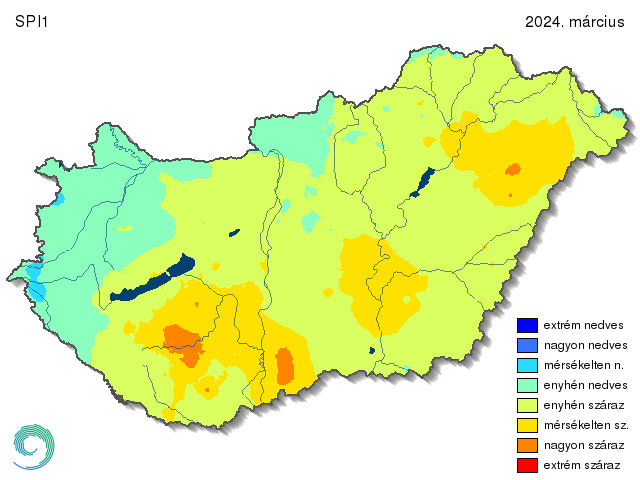 A standardizált csapadékindex (SPI) egyhavi értékeit 2024 márciusában mutatjuk be, mivel ez volt a legszárazabb a tavasz hónapjai közül. (13. ábra). A térképen hazánk legtöbb tája valamelyik száraz kategóriába tartozik. Csak a Börzsöny és a Cserhát, továbbá a Dunántúl nyugati térsége számít enyhén nedvesnek. Az ország túlnyomó része márciusban enyhén száraz volt, ezen belül három nagyobb terület (Hortobágy-Hajdúság-Nyírség területe, a Tisza és a Körös folyók torkolatának tágabb környezete, a Dunántúli-dombság Balatontól délkeletre eső része a Bácskai-síkvidékig) pedig mérsékelten száraz. Ennél eggyel erősebb kategória, a nagyon száraz is megjelenik több foltban: a Bácskai-síkvidéken, a Dél-Nyírségben, valamint az Észak-Zselic és a Dél-Külső-Somogy találkozásánál.
