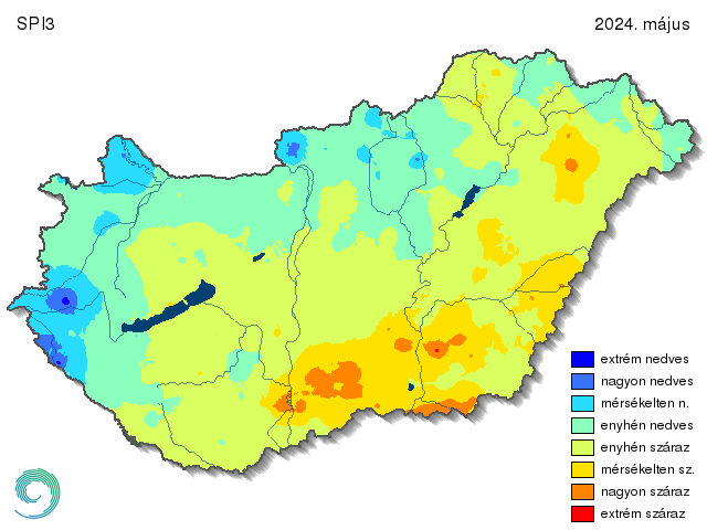 A május végén készült háromhavi SPI térkép (14. ábra) a tavasz során lehullott csapadékot bemutató 5. és 6. ábrákkal cseng össze. SPI3 esetén is az enyhén száraz kategória a legkiterjedtebb hazánkban, de már kisebb mértékben, mint az SPI1 esetén volt. A mérsékelten száraz területek viszont összefüggőbbek: a Duna-Tisza közének déli része, valamint a Körösöktől a déli határig tartó területek. Ezen belül a nagyon száraz tájak is többfelé megjelentek: Baja, Kiskunhalas és Szentes tágabb környezete, valamint a Maros folyótól délre fekvő tájak. Enyhén nedves területeket találunk a Dunántúl nyugati felén, a Dunántúli- és az Északi-középhegységben. A májusi heves esőzések következtében többfelé mérsékelten (pl. Győri-medence) és a nagyon nedves térségek (Börzsöny, Vas és Zala vármegyék) is akadtak. A tavasz legcsapadékosabb pontjai közelében pedig már az extrém nedves kategória is feltűnt.