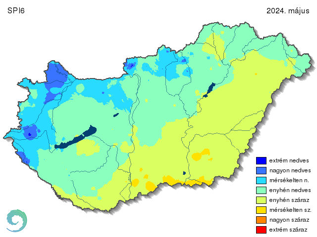 A májusi SPI6 a 2023 decembere óta lehullott félévnyi csapadékot veszi figyelembe. A december a megszokottnál sokkal csapadékosabb volt, ennek a hatása még a májusi SPI6 térképen is megjelenik (15. ábra). A Csurgót Tarcallal összekötő délnyugat-északkeleti irányú vonaltól délre találhatóak a száraz kategóriák, északra pedig a nedvesek. Így a fél évet átfogó összegzésben már a nedves kategóriák foglalják el hazánk nagyobb részét. Mérsékelten nedves kategóriával jellemezhetjük a Kisalföldet, a Nyugat-magyarországi-peremvidéket, a Dunántúli-középhegység keleti, valamint az Északi-középhegység nyugati felét. Kiterjedt területek is már nagyon nedvesnek számítanak ebben az időtávlatban: Győri-medence, Kemeneshát, Kerka-vidék. Viszont érdekes, hogy ez főként a tavaszi csapadékoknak köszönhető, mert pl. Hagyárosbörönd állomás télen enyhén nedvesnek számított, tavasszal pedig extrém nedvesnek, így a két időszak összesítésében szintén extrém nedves lett.