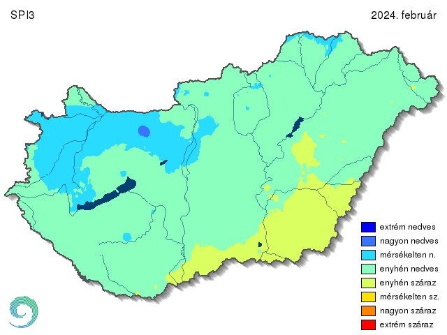 A standardizált csapadékindex (SPI) egyhavi értékei a tél folyamán 2024. februárjában érték el a meteorológiai aszály kategóriáját. Decemberben a csapadéktöbbletnek köszönhetően csak nedves területek jelentek meg az SPI1 térképen, januárban pedig enyhén nedves és enyhén száraz kategóriákra tagolódott hazánk. Mivel a február csapadékszegény volt szinte mindenhol, így az ország kb. 90 %-a valamelyik száraz kategóriába tartozott (13. ábra). Ott, ahol a hónapban kicsit több csapadékot mértünk – az Északi-középhegységben, a Mecsekben és attól nyugatra, valamint Zala vármegyében – azok a területek enyhén nedvesnek számítanak. Az Alföld legszárazabb területei – Berettyó-Körös-vidék, Körös-Maros köze –, ahol 10 mm alatt maradt a csapadékösszeg; azok már nagyon száraz és extrém száraz kategóriába kerültek.