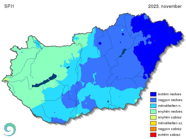 A 2023-as ősz az átlagosnál csapadékosabb volt, azonban szeptemberben a megszokottnál jóval kevesebb eső esett, míg novemberben csapadékos időjárás volt jellemző. Novemberben az egész ország valamelyik nedves kategóriába tartozott az SPI1 alapján (12. ábra). A Dunántúl legnagyobb része enyhén száraznak számított, innen kelet felé haladva egyre nedvesebb térségek voltak. A Dunától keletre fekvő tájakat már szinte csak nagyon nedves kategória uralta. Az ország északkeleti, keleti része pedig extrém nedvesnek adódott.