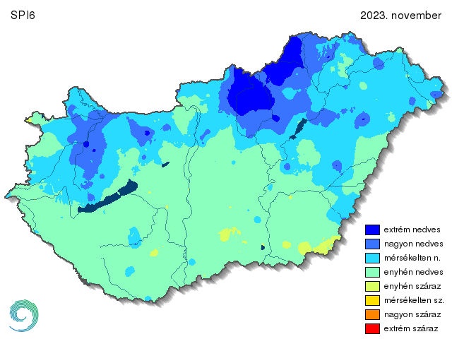 A még hosszabb időszakot figyelembe vevő standardizált csapadékindex az SPI6, aminek az eloszlását a 14. ábrán mutatjuk be. Ez már az elmúlt fél év, azaz a június 1. és november 30. között összegzett csapadékmennyiséget veszi alapul. Ekkor is csak foltokban jelenik meg az enyhén száraz kategória (pl.: a Mecsekben és az Alföldön). Az ország déli fele enyhén nedves volt ekkora időtávlatban. Az északi országrész már mérsékelten nedvesnek számított. Ezen belül a Marcal és a Rába mentén, valamint az Északi-középhegységben a nagyon nedves kategória volt a jellemző. Extrém nedves területek is megjelennek a térképen, összefüggően a Mátrában, a Bükkben és az Észak-magyarországi medencék területén, továbbá elszórtan, foltokban.