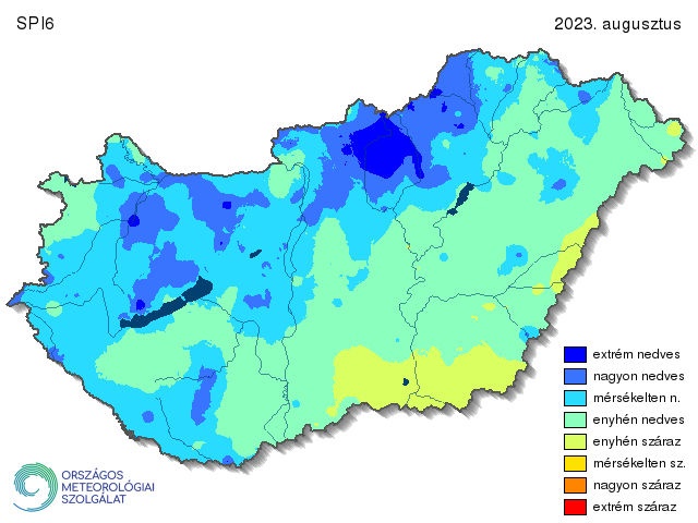 Az augusztusi SPI6 már figyelembe veszi a 2023 március és 2023 augusztus között érkező félévnyi csapadékot, így képet kaphatunk közel a teljes vegetációs periódusban lehullott csapadékmennyiségről. A helyzet annyiban hasonlít a háromhavi térképhez, hogy itt is észrevehető egy délnyugat-északkelet irányú határvonal, ami elválasztja a csapadékosabb és szárazabb területeket, de ebben az esetben ez a vonal sokkal keletebbre húzódik. Így csupán az Alföld déli részén és a keleti határ mentén azonosíthatók enyhén száraz területek. Az ország közel felén található mérsékelten vagy annál nedvesebb kategória. A Dunántúl északi részének körülbelül negyedén nagyon nedves, míg az Északi-középhegységnek mintegy felén nagyon vagy extrém nedves viszonyok voltak jellemzők. (15. ábra).