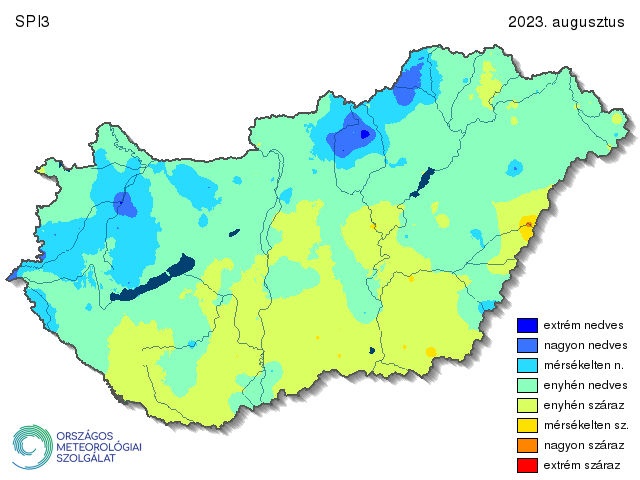 A háromhavi SPI 2023 augusztusából már a teljes nyári időszak csapadékösszegét figyelembe veszi (14. ábra). Jól látható, hogy az északi és déli területek elkülönülnek egymástól egy délnyugat-északkeleti tengely mentén. A déli vidékeken jobbára az enyhén száraz és enyhén nedves területek váltakoznak, míg északon az enyhén nedves kategória mellett nagyobb foltokban jelentkeztek mérsékelt és nagyon nedves besorolású területek.