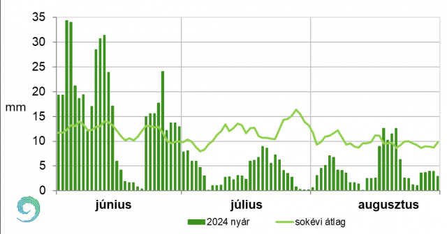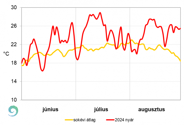 A 2024-es nyár napi középhőmérsékleteit és a sokéves átlag értékeit a 9. ábrán mutatjuk be. Ezen megfigyelhető, hogy az évszak 92 napjából 75 napon a normálnál magasabbak voltak a napi átlaghőmérsékletek. Ez legtöbbször egybefüggő meleg napokat jelentett, amiket csak 1-2 hűvösebb nap szakított meg. Csak kettő hosszabb – 5 napos – hűvös időszak volt az évszakban: június 11-15. és augusztus 3-7. közt. A június 10-11-én hazánk felett átvonuló hullámzó frontrendszer nagy lehűlést hozott magával: 12-én és 13-án több, mint 3 °C-kal maradt el a sokéves átlagtól a napi középhőmérséklet. Június 13. lett az évszak leghűvösebb napja: 16,3 °C-os napi átlaggal. Ezt követően egy 16 napos meleg periódus következett: a hőmérséklet gyors növekedésnek indult, és június második felében már az első harmadfokú hőségriasztásra is sor került. Ezt a július 1-én érkező hidegfront törte meg, mely bár jelentős lehűlést eredményezett, csak pár napig tartott. Július 5-től megkezdődött a 2024-es nyár leghosszabb és legintenzívebb hőhulláma, július 7-től ismét harmadfokú hőségriadó lépett életbe. Az évszak legmelegebb napja is ekkor volt: július 16-án 28,9 °C-os napi középhőmérsékletet rögzítettünk, mely 7,7 °C-kal haladja meg a sokéves értéket. Az augusztus is tartogatott hosszú meleg periódusokat és hőségriadókat is. 8-tól jelentős melegedés, majd újabb tartós hőhullám vette kezdetét, 11-étől másodfokú, 14-től harmadfokú hőségriadót rendeltek el. Bár 21-én egy hidegfront némi enyhülést hozott, a napi középhőmérsékletek még mindig a sokéves átlag felett maradtak. A hónap utolsó hetére visszatért a hőség, a szokásosnál 6-7 °C-kal melegebb idővel és másodfokú hőségriadóval ért véget a nyár.