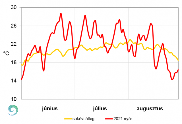 A következőkben összefoglaljuk, hogyan változott az országos átlagban vett napi középhőmérséklet a 2021-es nyár során.
